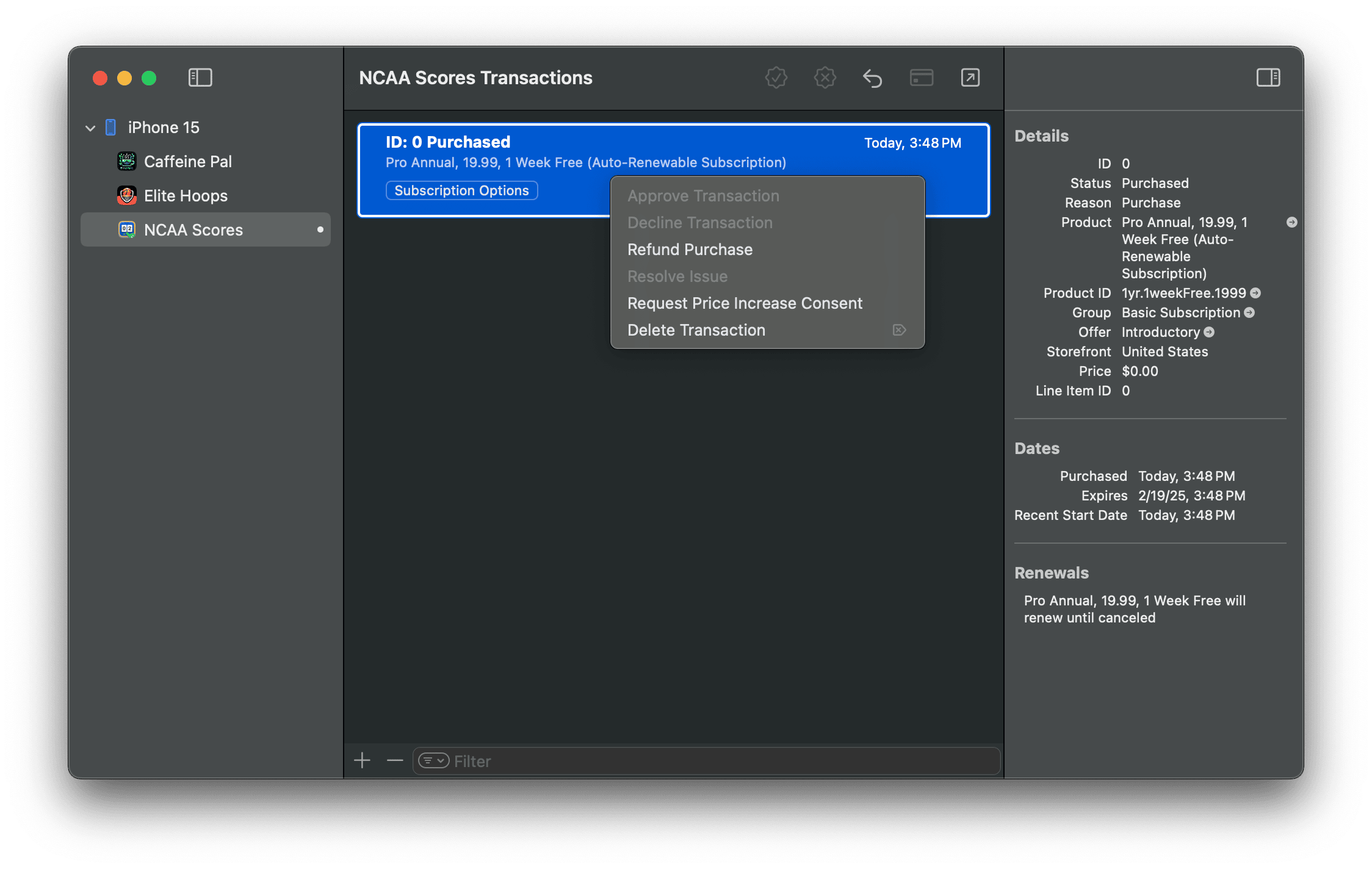 Use this to quickly test purchasing your products. Once you make a purchase, you can open Transaction Manager to delete it, refund it, request parental approval and much more. Most commonly, you'll probably delete the transaction to reset your subscription state: